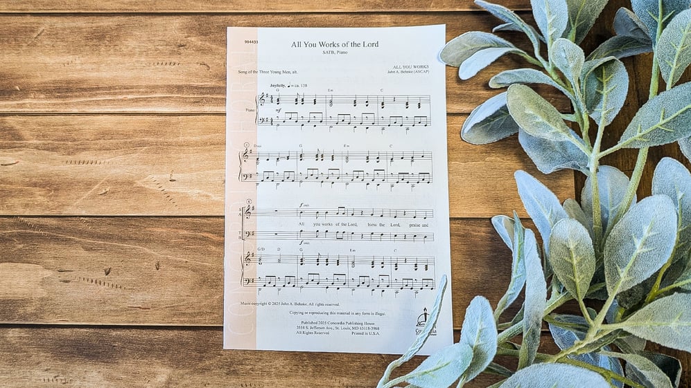 John A. Behnke’s arrangement of “All You Works of the Lord” is set for SATB choir and piano accompaniment. The piece begins with all four voices singing the canticle’s refrain in unison: “All you works of the Lord, bless the Lord, praise and magnify Him!”